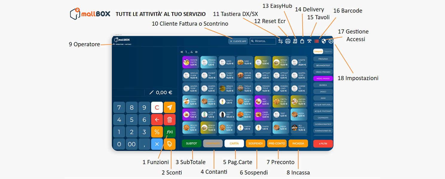 MallBox 2.0 permette di avere un gestionale totalmente Mobile per il punto cassa, con un back-end web che garantisce il controllo di ogni aspetto e un'applicazione end-user per le funzioni fidelity dei clienti.
